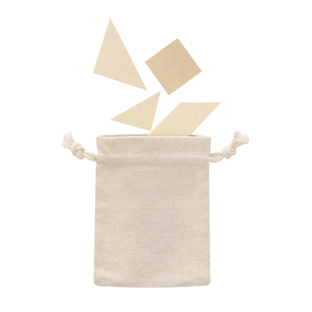 puzzle con piezas de madera para despertar el ingenio y habilidad de los más pequeños. en bolsita de algodón con cuerdas ajustables para cierre.