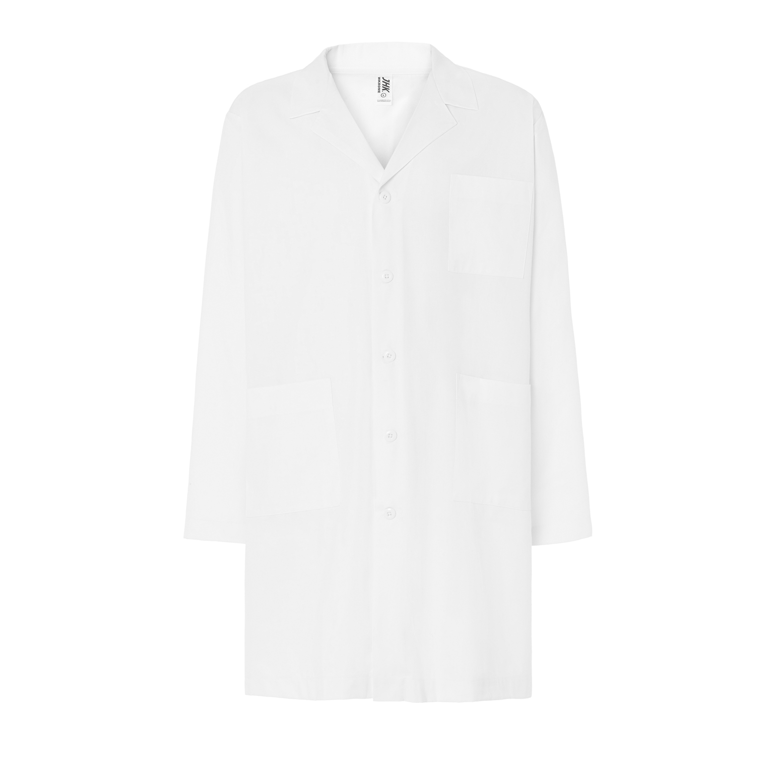 bata de hombre. cuello en v. bolsillo en el pecho en el lado izquierdo y dos bolsillos delanteros en la parte inferior. cinco botones frontales a tono. cinturón en espalda.