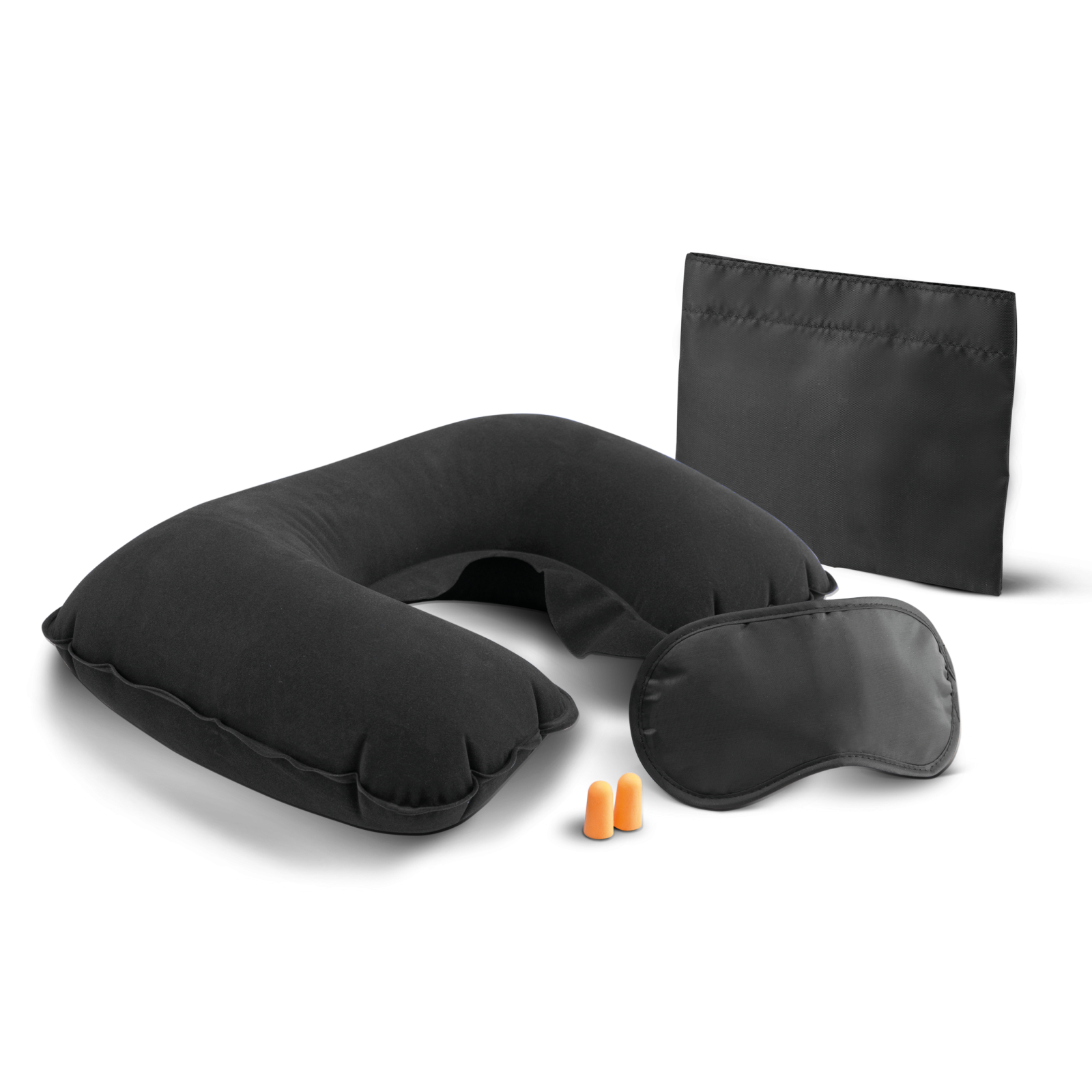 set de viaje en poliéster 210d, con funda personalizable. cierre de velcro. compuesto por antifaz, tapones, y almohada de aire. cierre con scratch central, práctico y rápido. 3 accesorios imprescindibles para viajar.set de viaje.