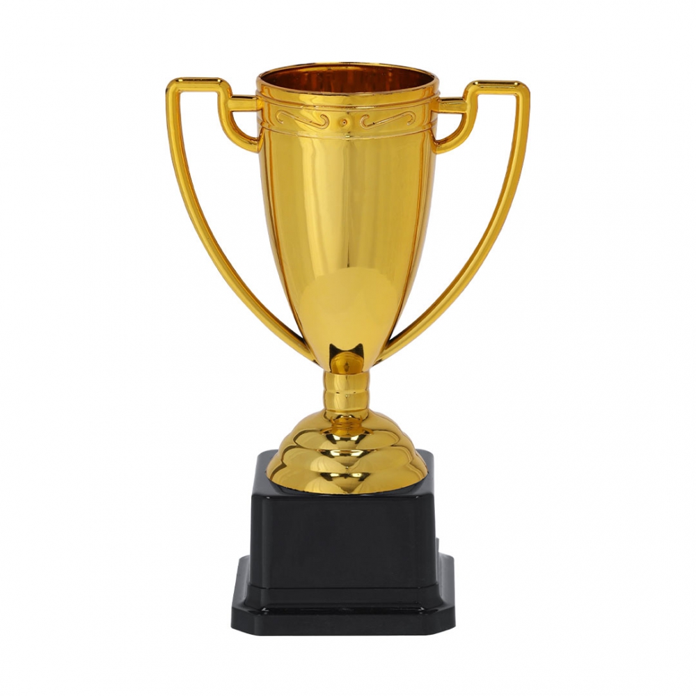 trofeo con un elegante acabado brillante en color dorado, diseñado con amplias asas y una base en color negro para un toque distintivo.